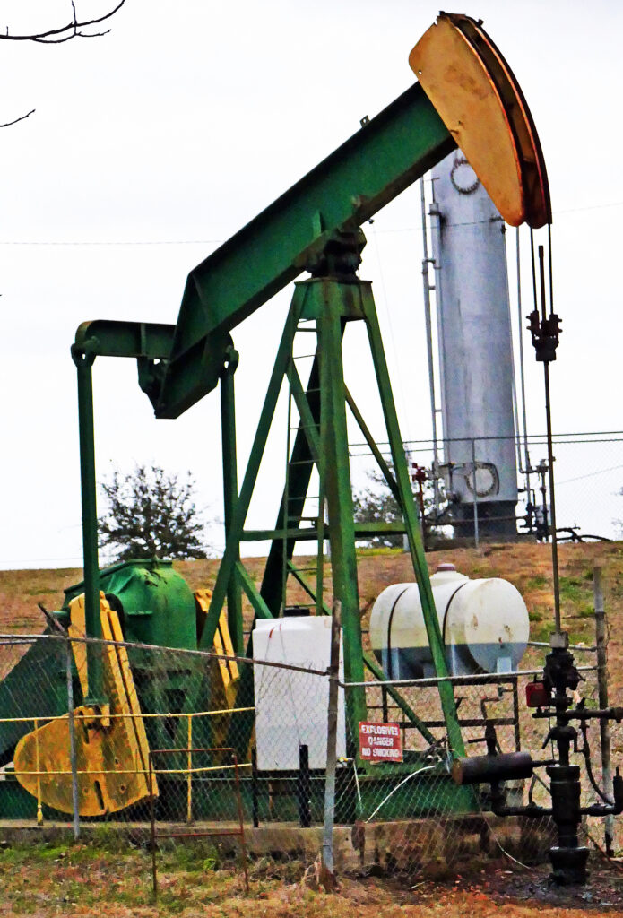 A pumpjack operating at an oil well in Natchez, Mississippi. A pumpjack is used to mechanically lift liquid out of the well if not enough bottom hole pressure exists for the liquid to flow all the way to the surface.
