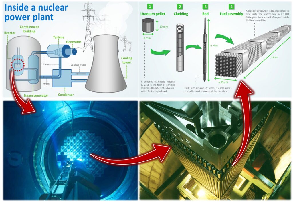 - The heat produced by fission is used to boil water, generate steam, and turn turbines, then generators.