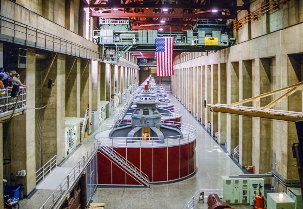 Seventeen generators create power at Hoover Dam, built in 1935. The dam produces four billion kilowatt-hours of electricity annually.