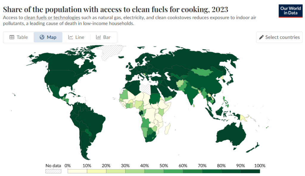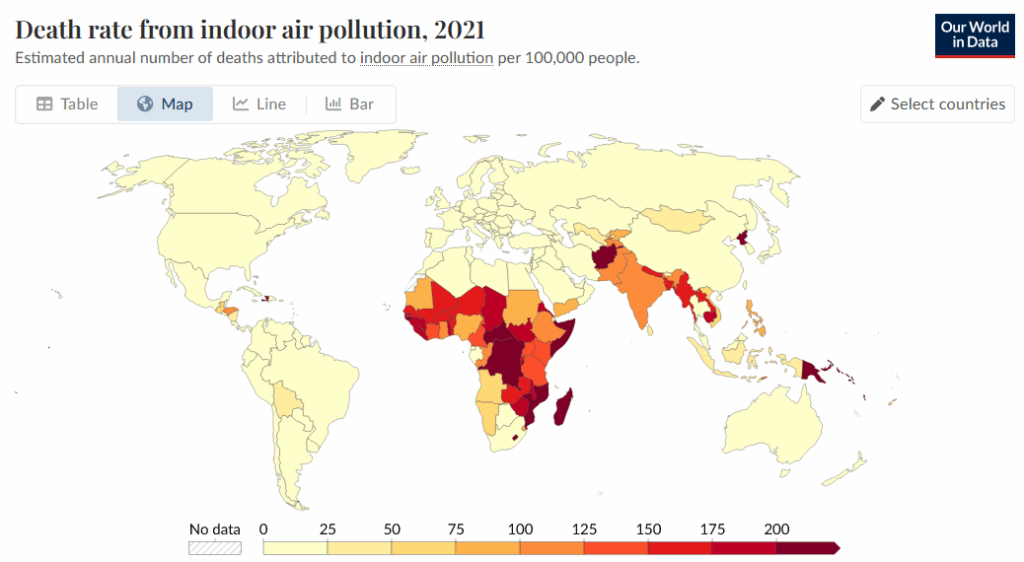 Question 3: The two maps seem connected because countries with low access to modern cooking fuels (lighter colors in the first map) often have higher death rates from indoor air pollution (darker colors in the second map). This suggests that when people don’t have non-biomass fuels, they may use fuels that harm their health and increase deaths.