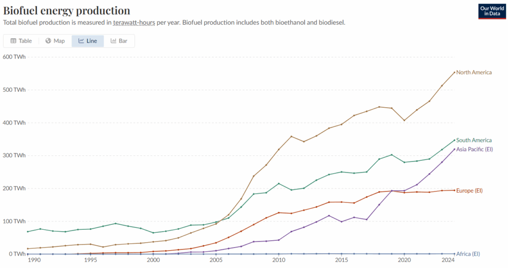 Question 3: Why might the region of Africa have lower biofuel energy production levels, despite having large agricultural areas? What factors could be influencing this trend?