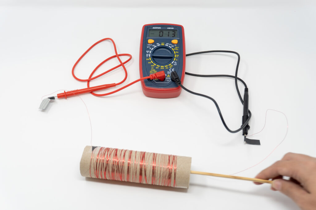- Generate electricity: Quickly move the skewer with the magnet all the way through the center of the coil and then back out. Do this in one smooth motion. Watch the voltmeter and record the highest voltage (peak voltage) you observe during the motion.