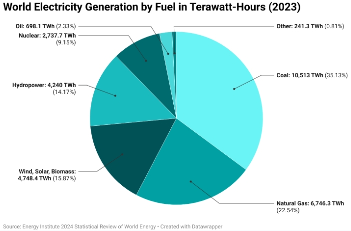 Study the above chart and calculate what percentage of global electrical generation in 2023 came from hydrocarbons. Show your work.