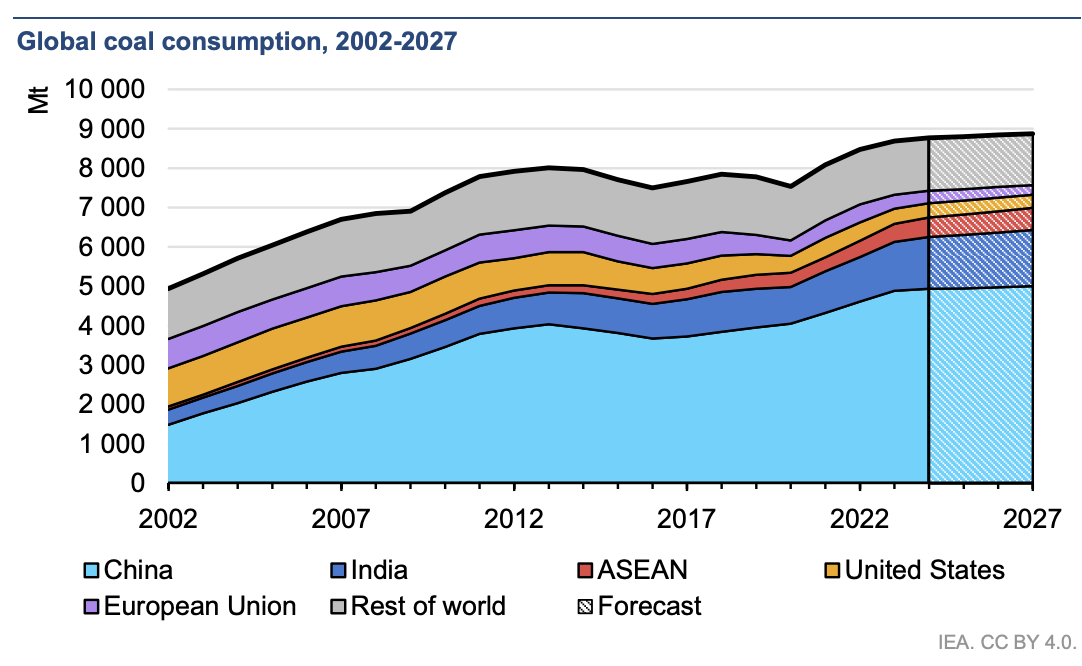 Q3: Using the data provided, calculate ASEAN’s share of global coal consumption in 2023 and in 2027. How does this share change over the period? Show your calculations.