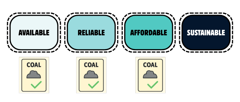 Coal is affordable, available, and reliable. However, it is not sustainable due to its high emissions.