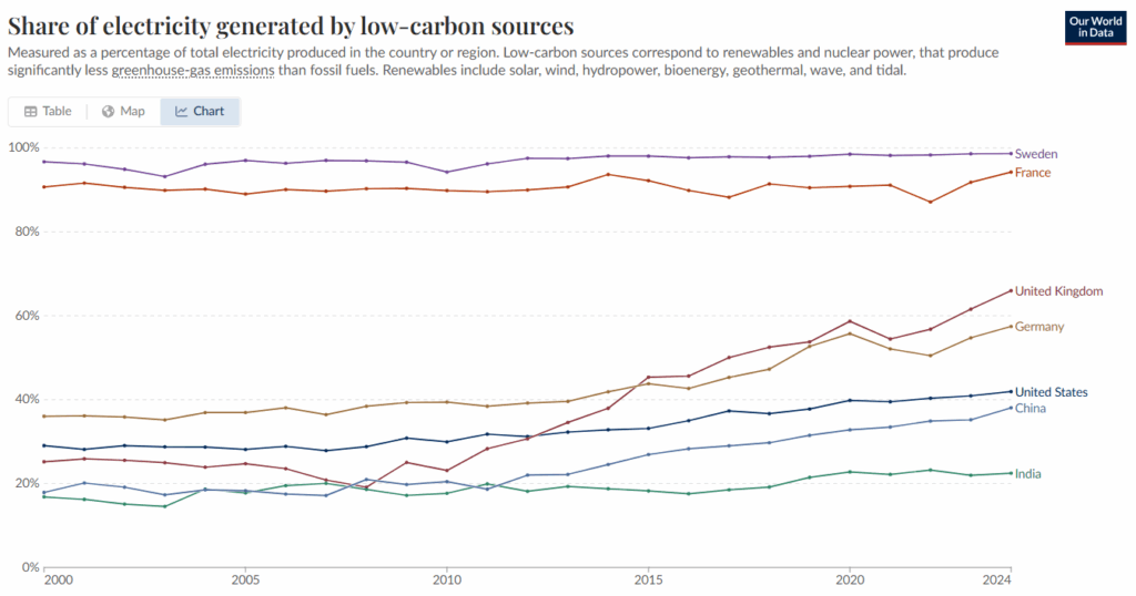 What do you notice about Sweden and France’s share of electricity generated by low-carbon sources from 2000 to 2024? How are their trends different from the other countries on the graph?