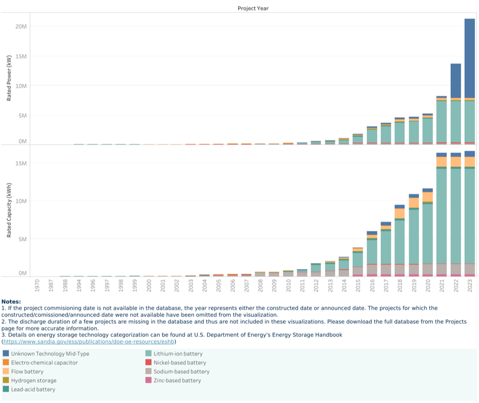 The graph includes storage projects labeled as “unknown technology mid-type.” Why might some projects not have their technology type listed? How does that affect what we can learn from the data?