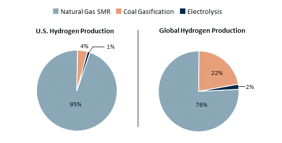 The graph below shows how hydrogen is currently produced in the U.S. and around the world. It highlights the dominant role of hydrocarbon-based hydrogen, as well as the relatively small share produced using electrolysis. Although electrolysis can produce hydrogen with very low emissions, it currently represents a small share of hydrogen production because of its high cost and need for large amounts of electricity.