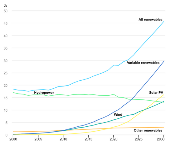 Source: IEA (2024), IEA, Paris https://www.iea.org/data-and-statistics/charts/share-of-renewable-electricity-generation-by-technology-2000-2030, License: CC BY 4.0