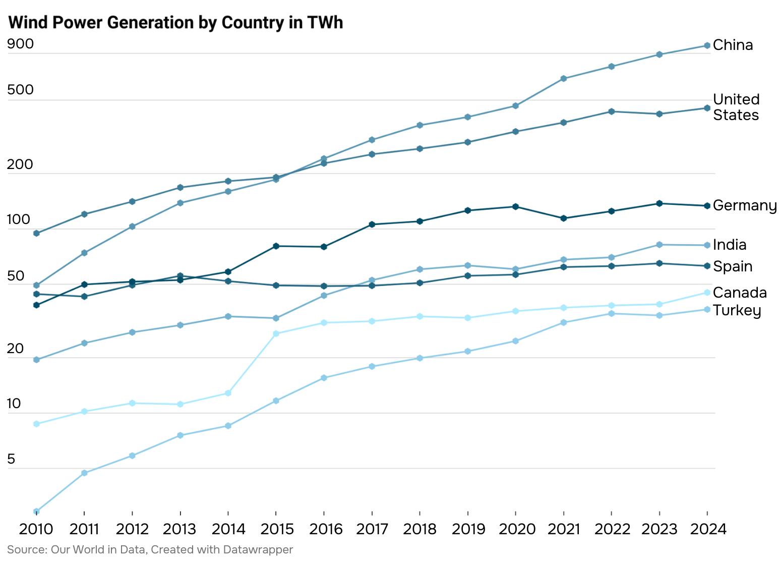 Add up the 2024 wind energy generation in terawatt hours of every country on the chart, except China. How does China’s 2024 wind energy production compare to the combined production of the other six countries?